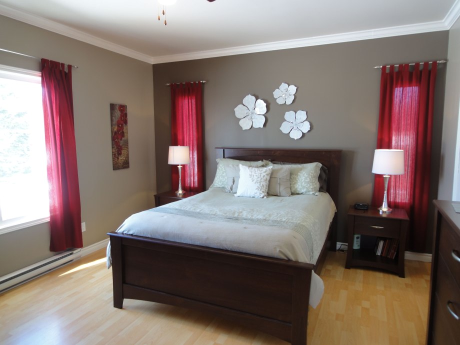 Бежевая спальня с красными шторами