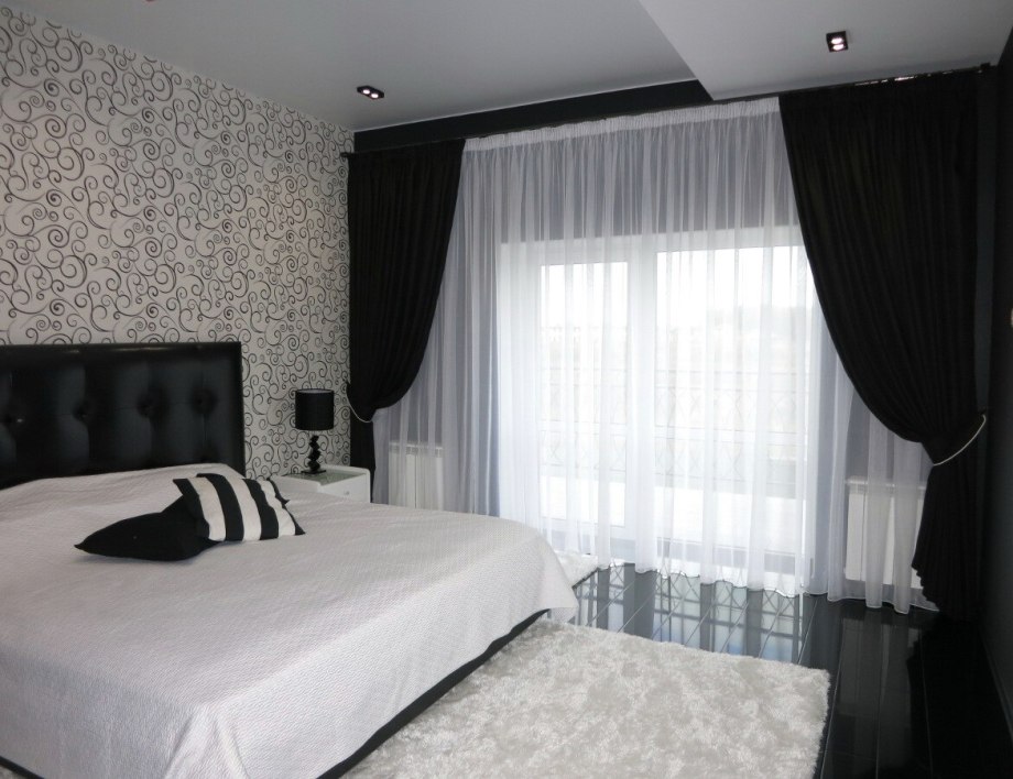 Черные шторы в интерьере спальни