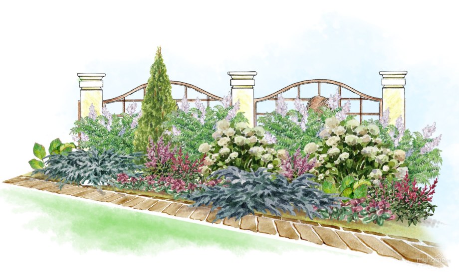 Миксбордер из хвойных и кустарников схемы вдоль забора