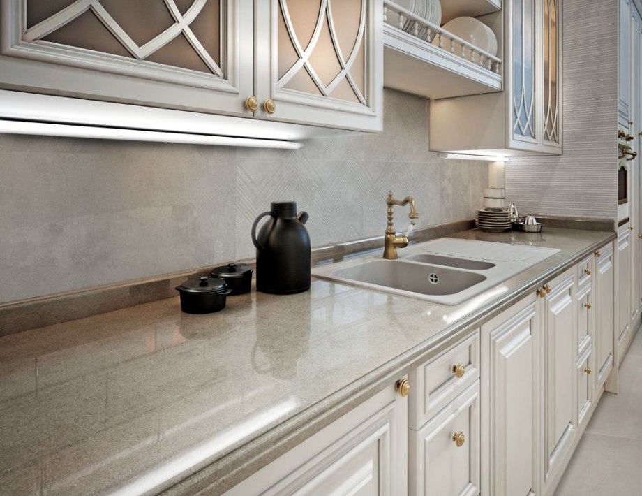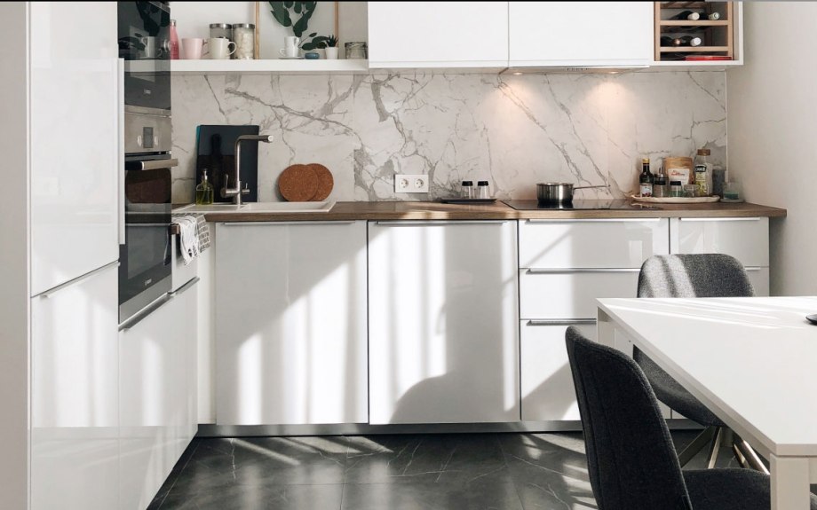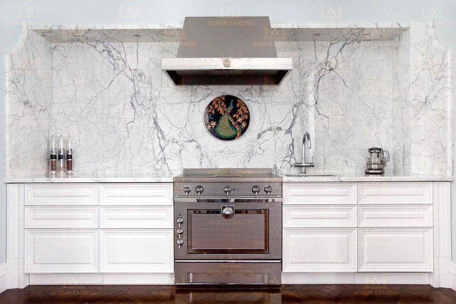 Кухонный фартук из керамогранита под мрамор (78 фото)